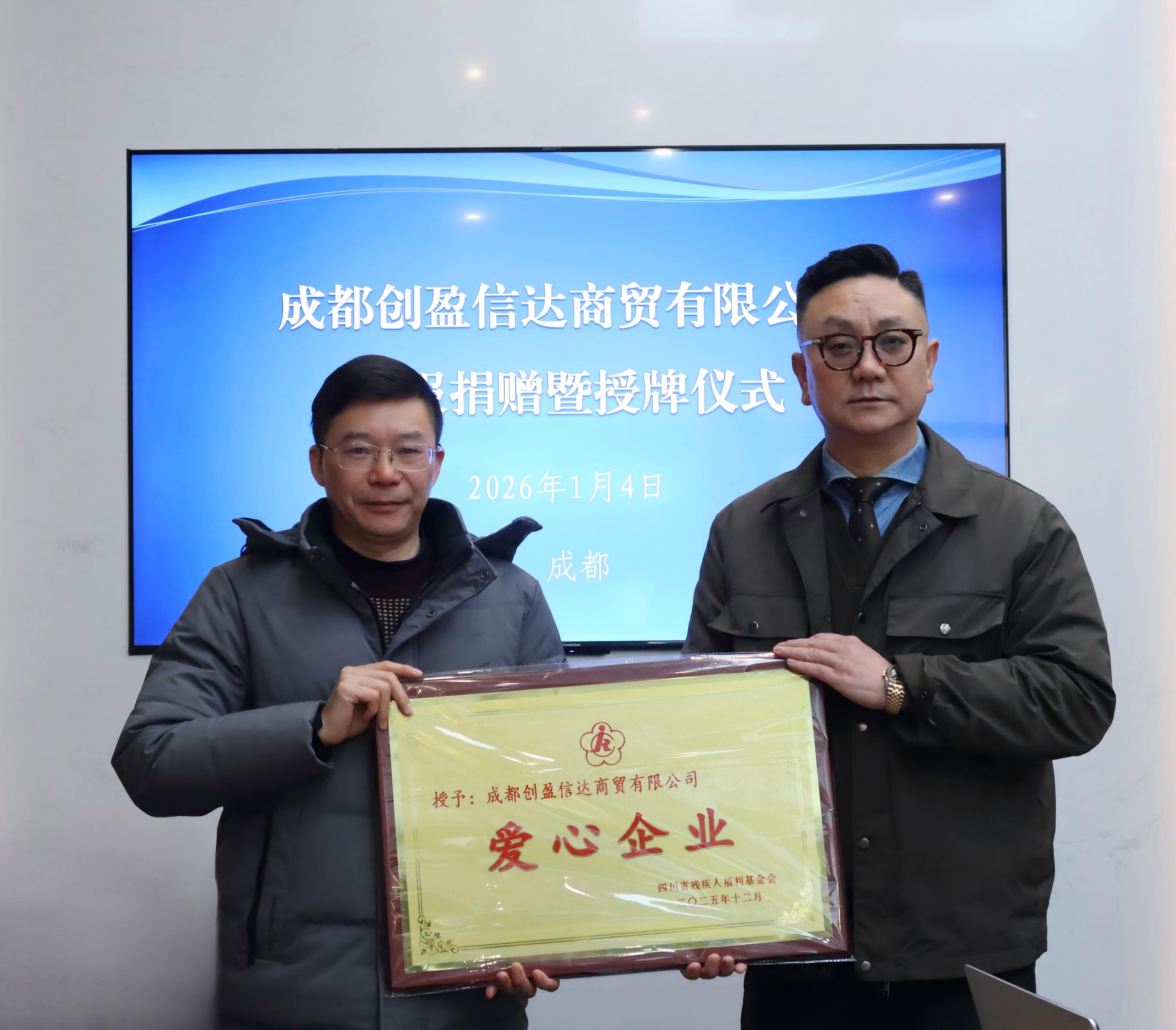 2026年1月4日下午,四川省残疾人福利基金会与成都创盈信达商贸有限公司主要负责人在基金会一楼会议室举行了衣服捐赠暨授牌仪式。成都创盈信达商贸有限公司总经理樊皓剑和四川省残疾人福利基金会秘书长阮国华及双方主要负责人参加了此次捐赠暨授牌仪式。